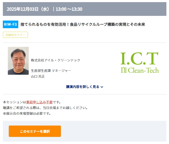 また、12月3日(水)におきましては、13:00~13:30にて当社生産課マネージャーの山口による講演も行います。