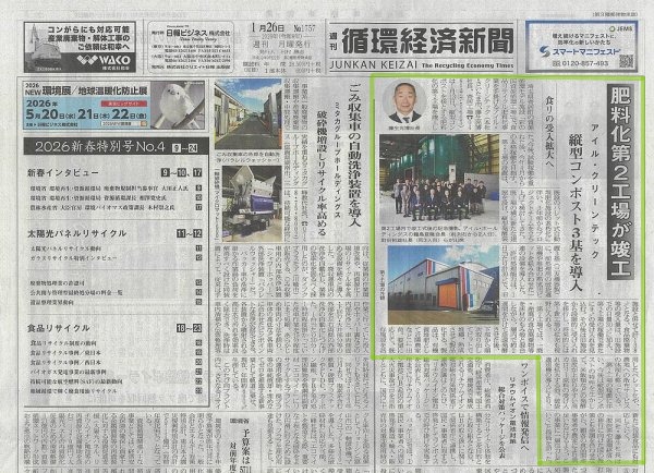 『循環経済新聞』(1月26日号)に、当社第二工場の竣工記事が掲載されました